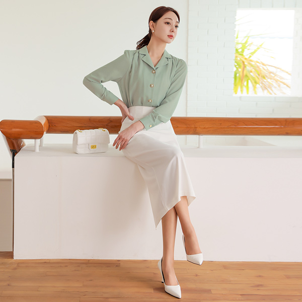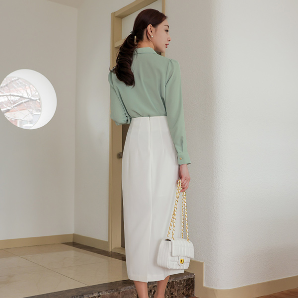 ダブルカラー ショルダーシャーリング 真珠ボタン ブラウス(spring)