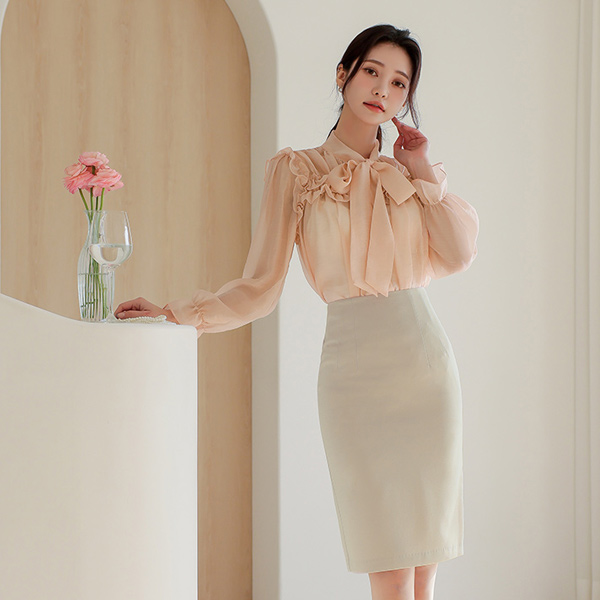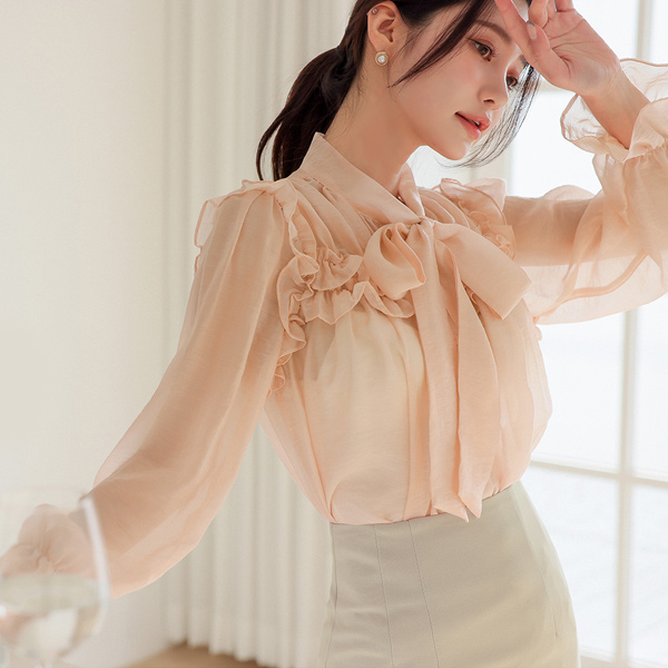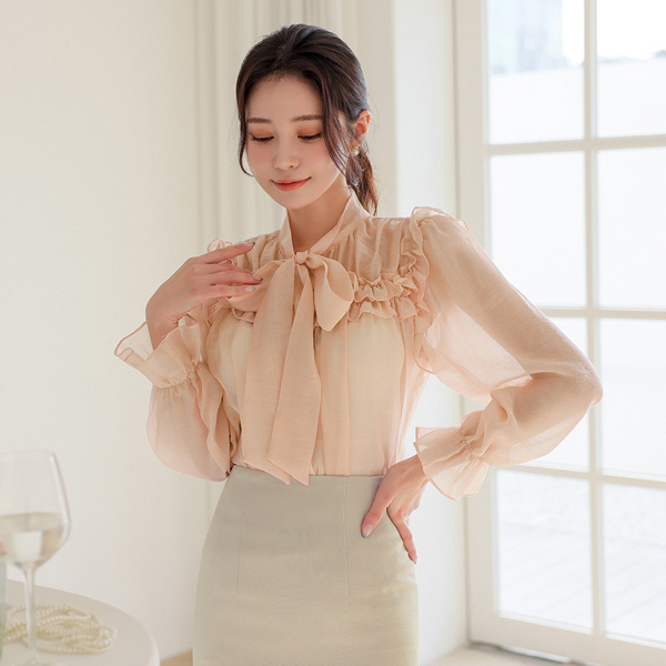 サテン シースルー ラッフル スカーフ ブラウス