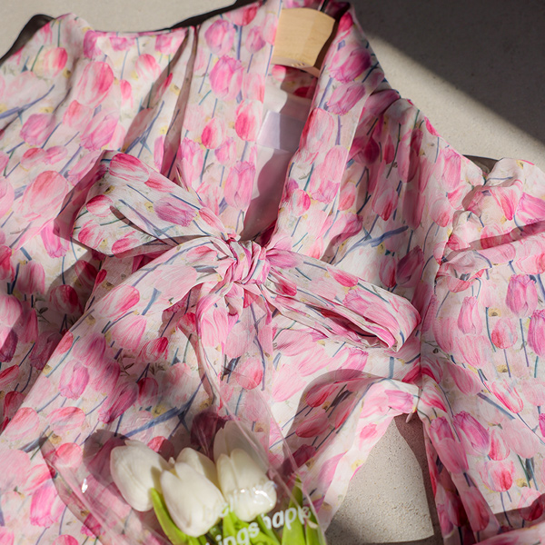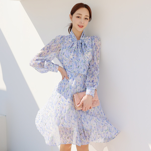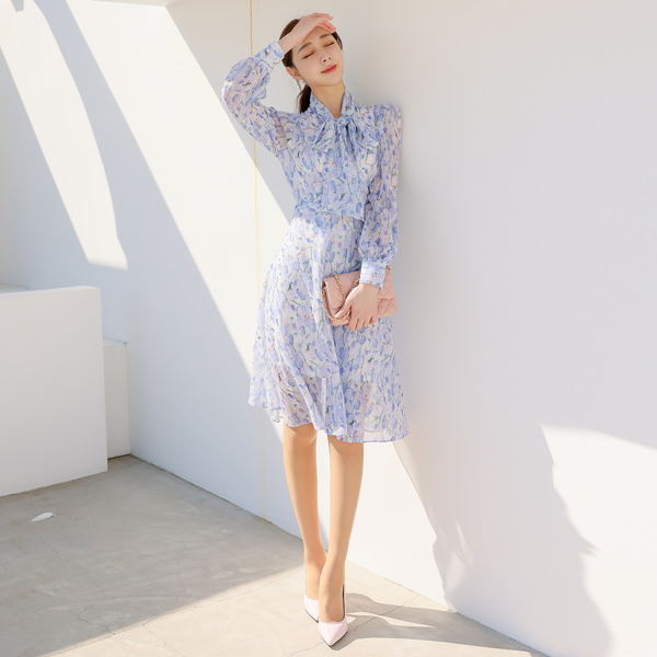 チューリップ シフォン リボン タイ フレア ワンピース