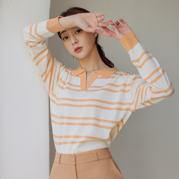 オープン カラー ストライプ ニットティーシャツ