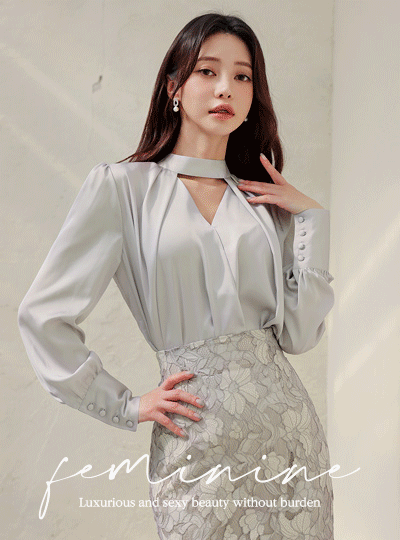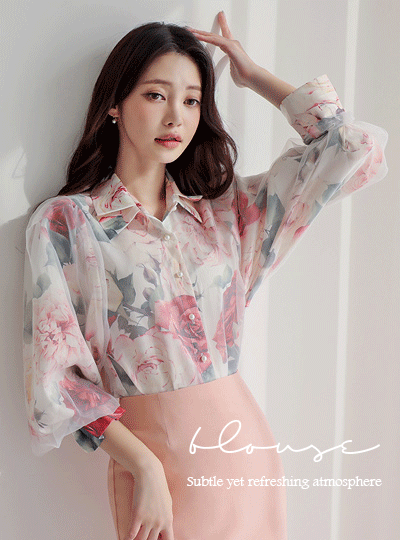 ローズ オーガンザ ピンタック·カラー パフ袖 ブラウス Ⅱ