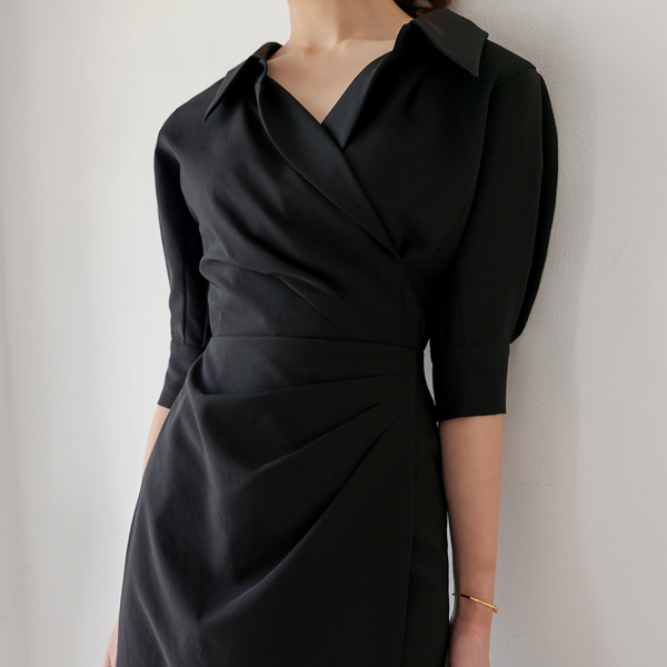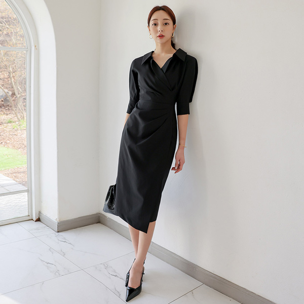 オープン カラー パフ 袖 アンバランス スリット ワンピース