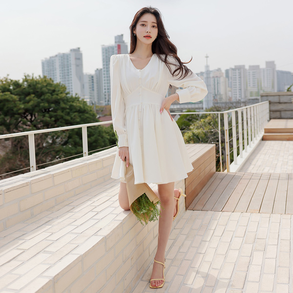 ロマンチック ショルダー シャーリング フレア ミニ ワンピース