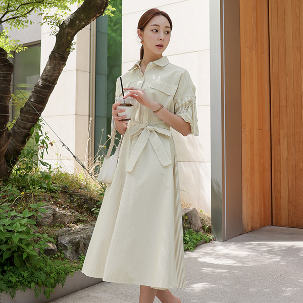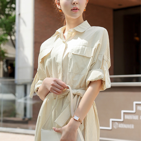 ストライプ ベルティード フレア ロールアップ シャツ ワンピース