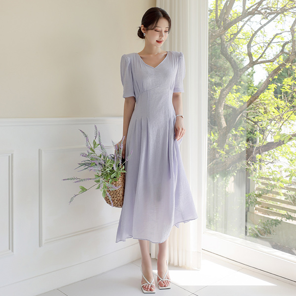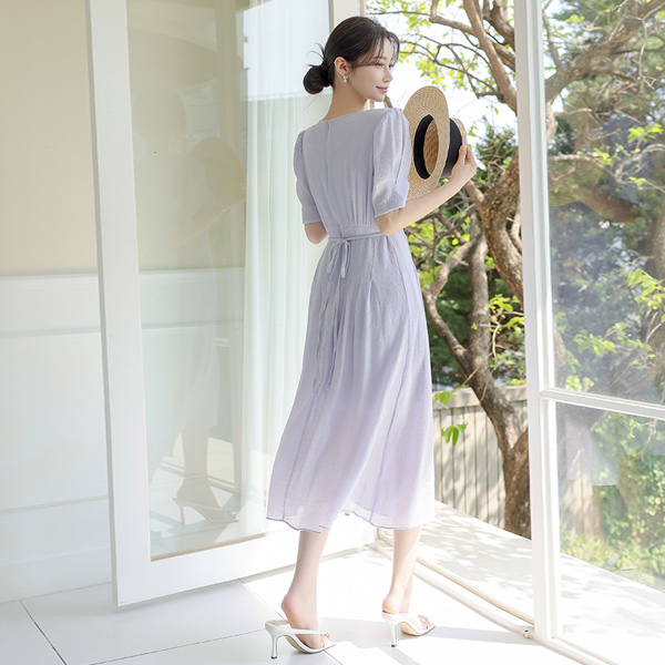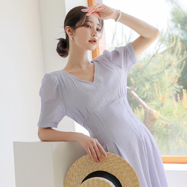 プリーツ リンクル パフ袖 リネン ロング ワンピース