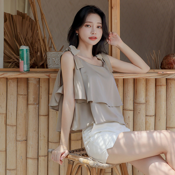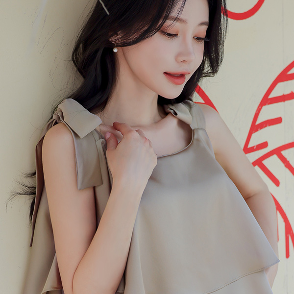 サテン カンカン フリル 袖なし リボン ブラウス