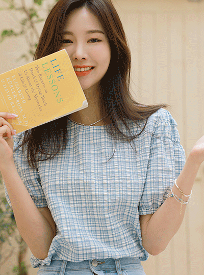 パステル チェック パタン ラブリー 袖 シャーリング ワプル ブラウス