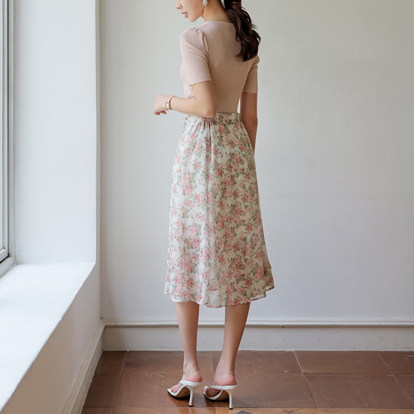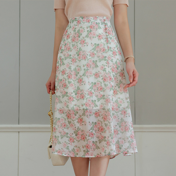 ローズ 花柄 콩 ボタン シフォン スカート