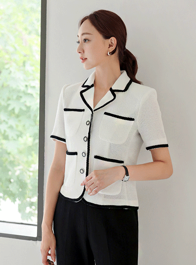 配色 裏地 リネン ツイード 半そで ジャケット