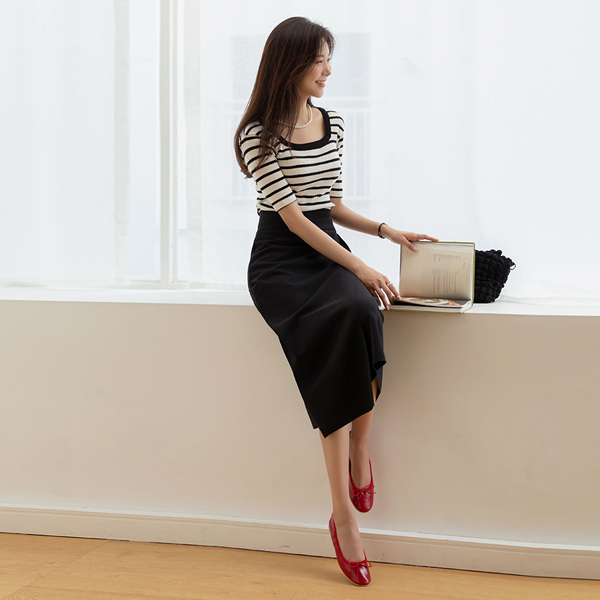 いい伸縮性 スクエアネック スリムフィット ストライプ ティーシャツ
