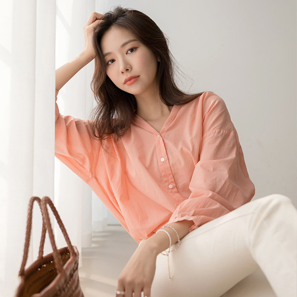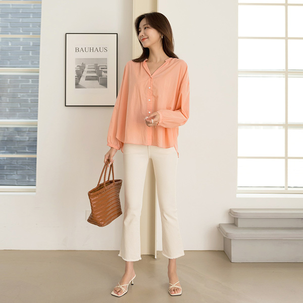 ピュア きれいなフィット バルーン 袖 ノーカラー ブラウス