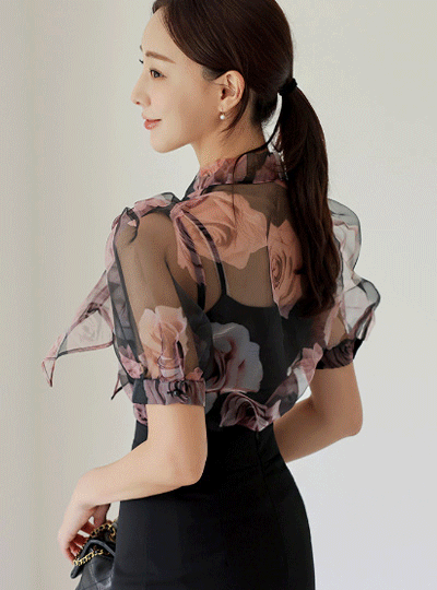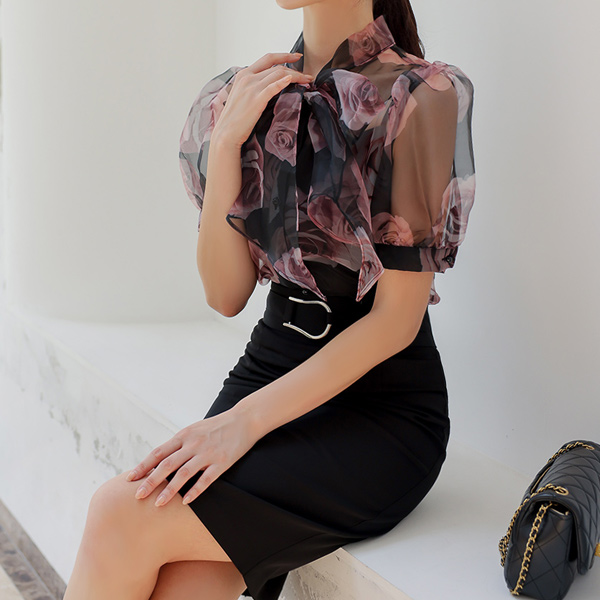 ローズ オーガンザ リボンタイ パフ ブラウス