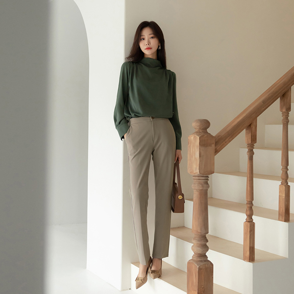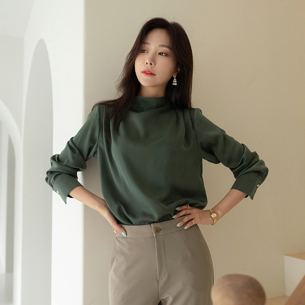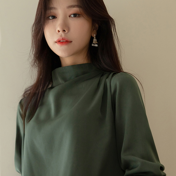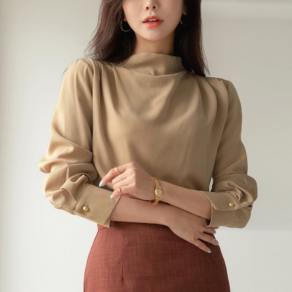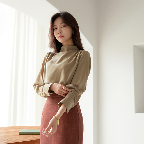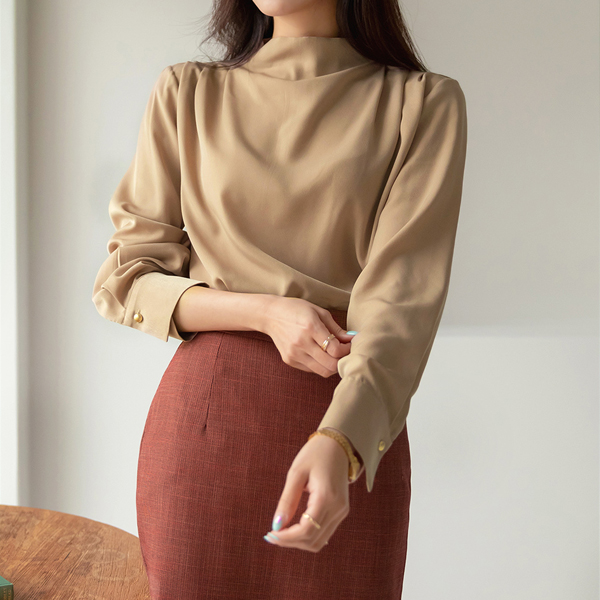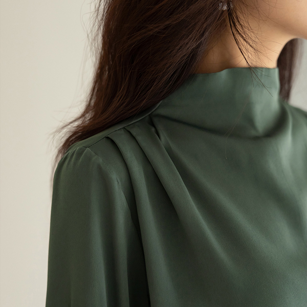 グロッシー ショルダー ピンタック セミハイネック ブラウス
