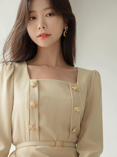 ラグジュアリー ダブル ゴールド ボタン スクエアネック ワンピース(ベルトSET)