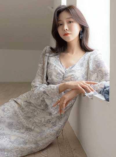 女性らしい 花柄 パタン 袖 シャーリング シフォン ワンピース
