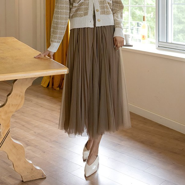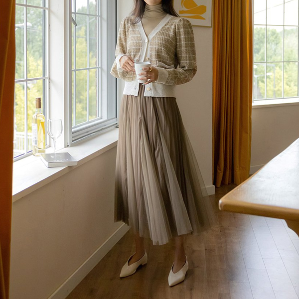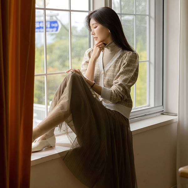 ロマンチック パフ 袖 パール ツイード ニット カーディガン