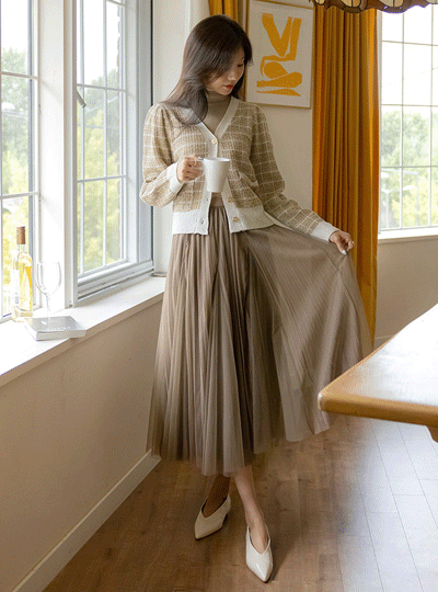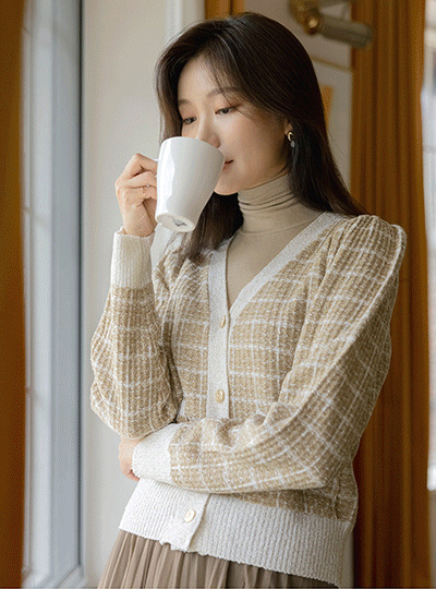 ロマンチック パフ 袖 パール ツイード ニット カーディガン