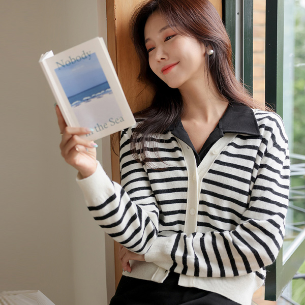 ぽかぽかした ウール ブイネック ストライプ カーディガン