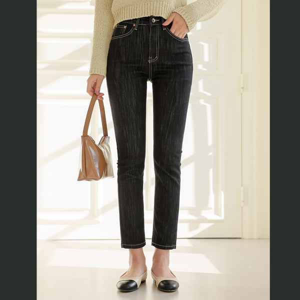ピュア ステッチ ポイント 生地 スリムストレート デニム パンツ