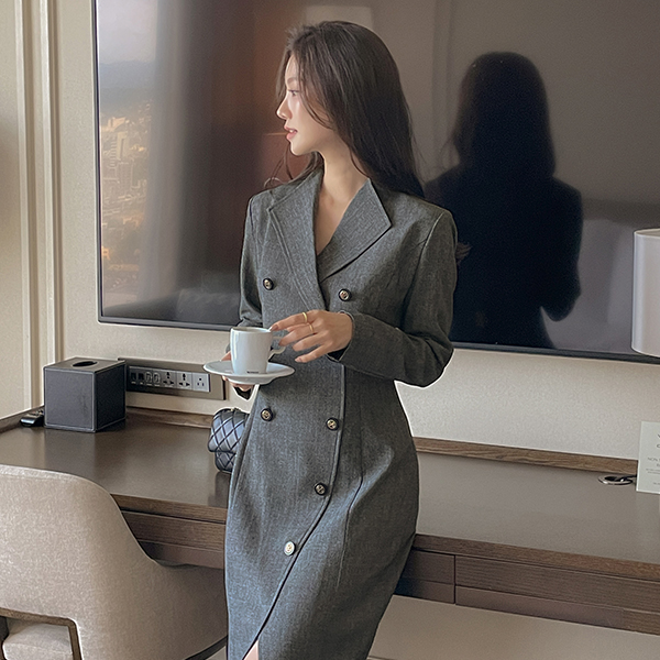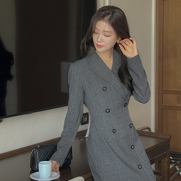 斜線チェック ウイングカラー ダブル ボタン ワンピース