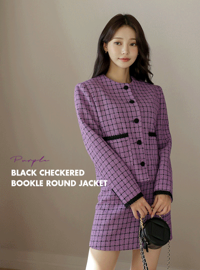Black チェック ブークレ ラウンド ジャケット