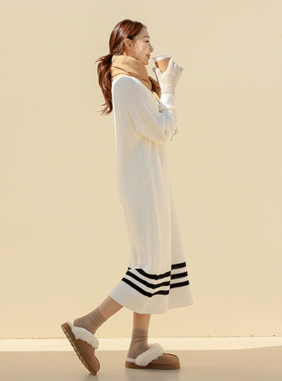 ぽかぽかした はち 配色 Vネック マキシ ニット ワンピース