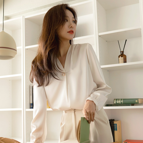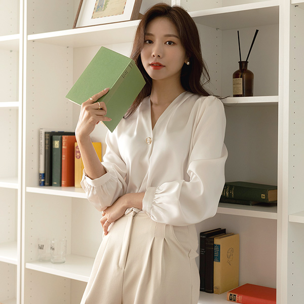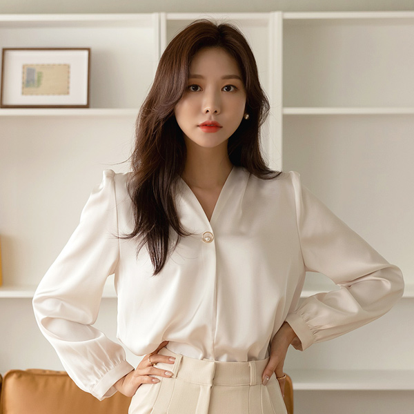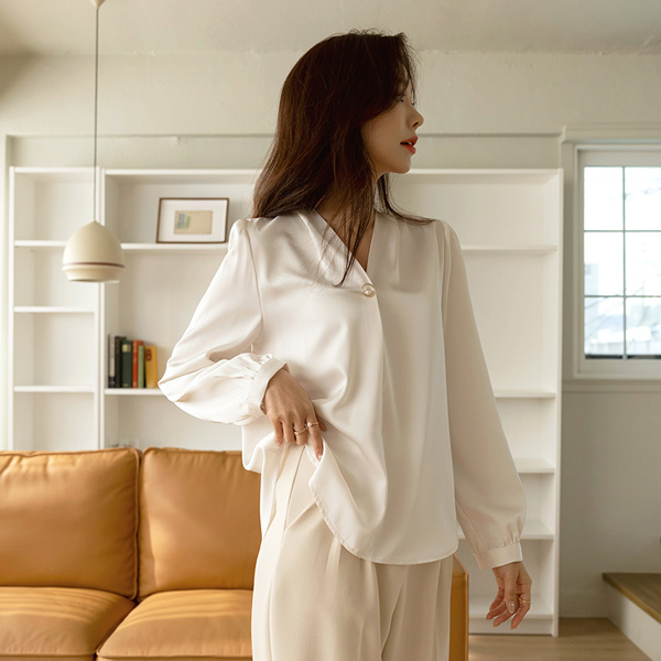 グロッシー サテン ゴールドリング 真珠 ポイント ブラウス