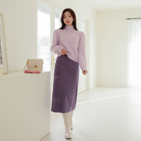 ロマンチック ミックス カラー セミハイネック パフ袖 ニット