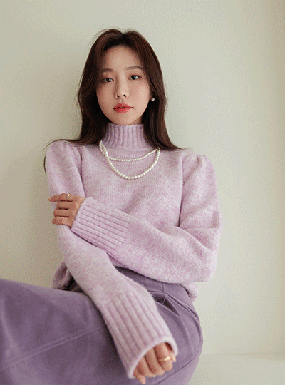 ロマンチック ミックス カラー セミハイネック パフ袖 ニット
