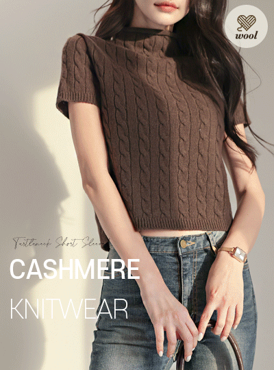ミニマル ケーブル とっくりえり 半そで ウール ニット