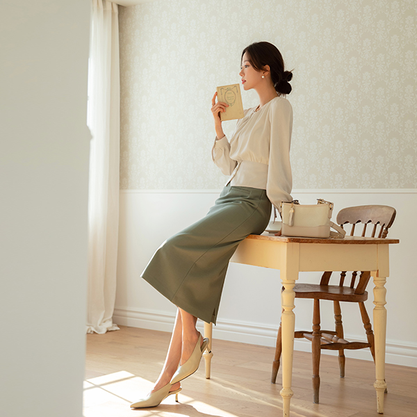 エレガンス 真珠ボタン シャーリングネック グロッシー ブラウス