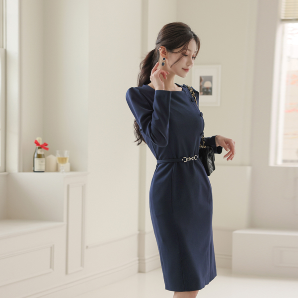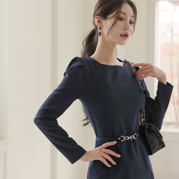 サイド ボタン ベルティード 弾力 ワンピース