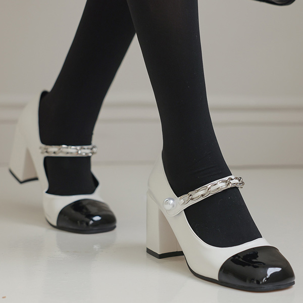 チェーン ストラップ ツートーン 配色 メリージェーン パンプスヒール