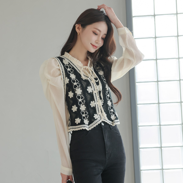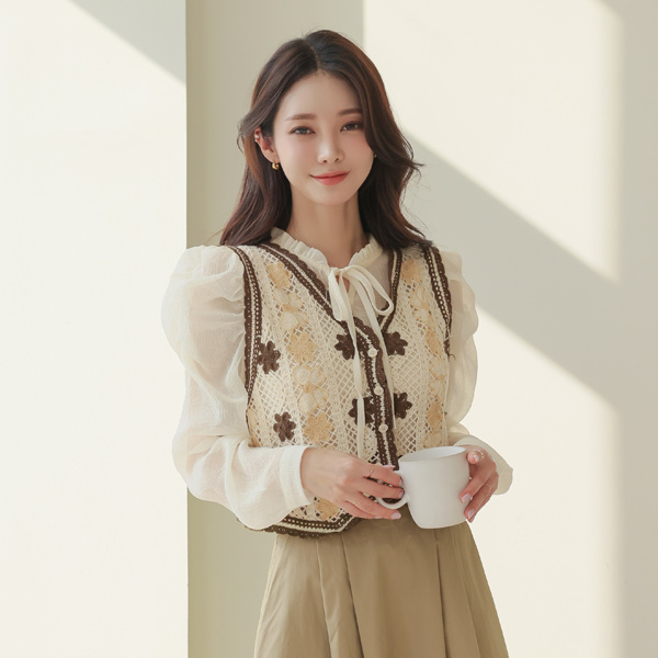 花柄 ニット ベスト&シースルー リボン ブラウス SET