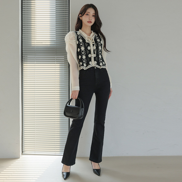 花柄 ニット ベスト&シースルー リボン ブラウス SET