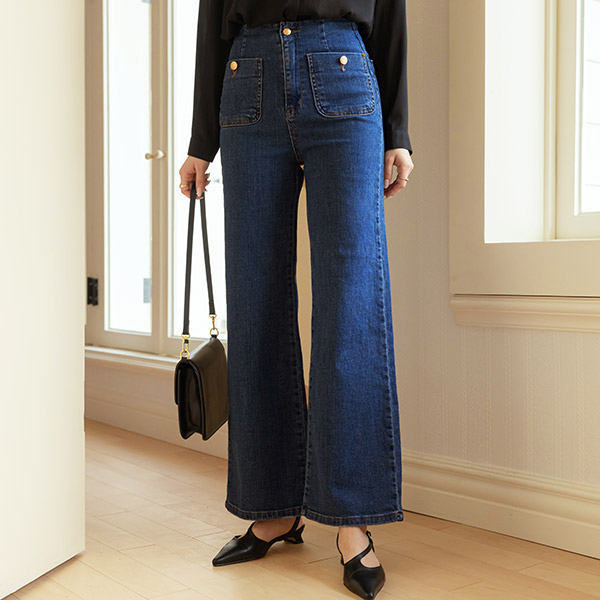 ゴールド ボタン ワイドフィット レトロ ポケット デニム パンツ