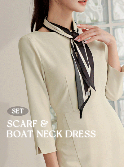 スカーフ&ボートネック 切開ライン ワンピース SET