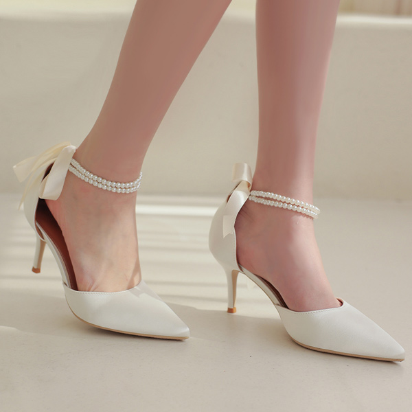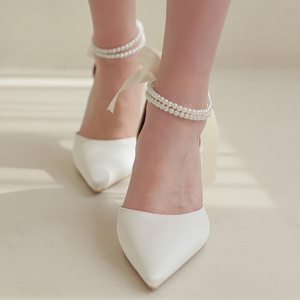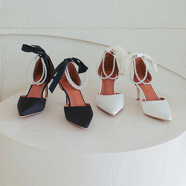 シルク ダブル 真珠 ストラップ リボン スティレット ヒール
