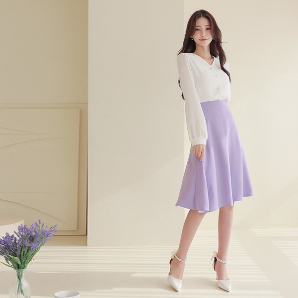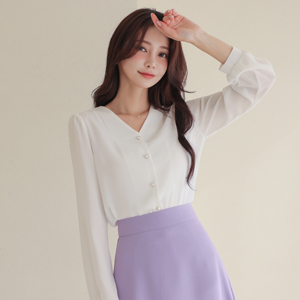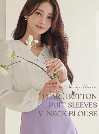 真珠 ボタン パフ 袖 ブイネック ブラウス(長袖)