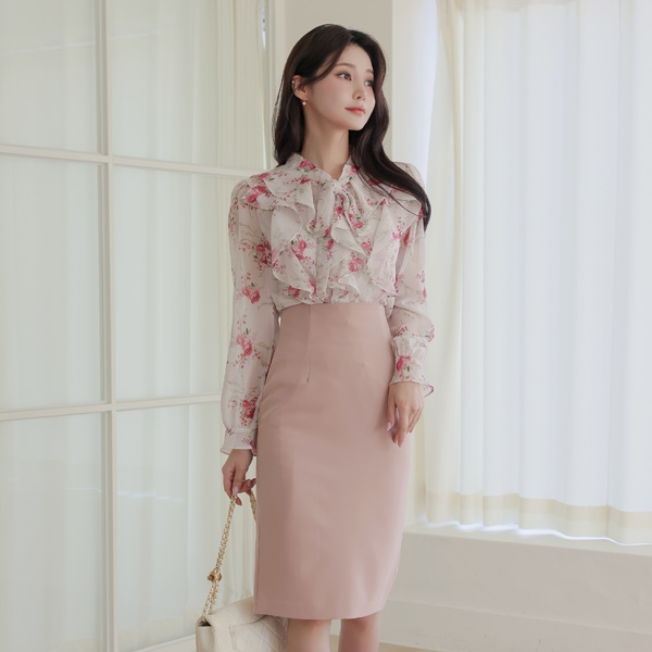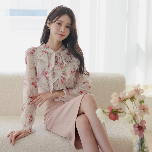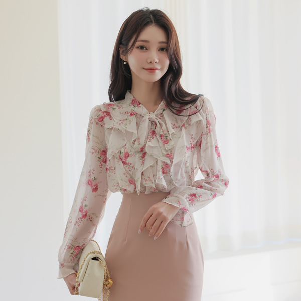 ロマンチック 花柄 フリル リボン タイ ブラウス