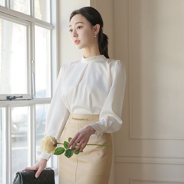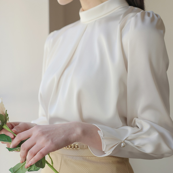 サテン ロールネック 逆様 真珠 ブラウス
