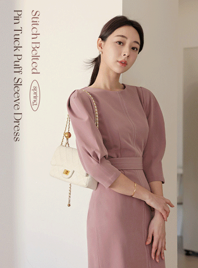 ステッチ ベルティード ピンタック パフ スリーブ ワンピース(spring)