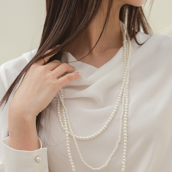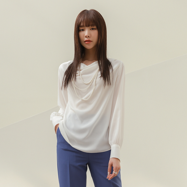 エレガンス カウルネック ダブル 真珠 ボタン ブラウス