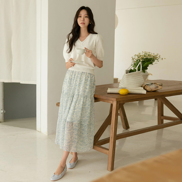 ラブリー カラー パフ袖 ブイネック コットン ニット