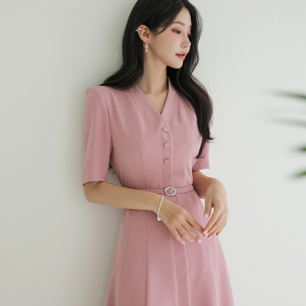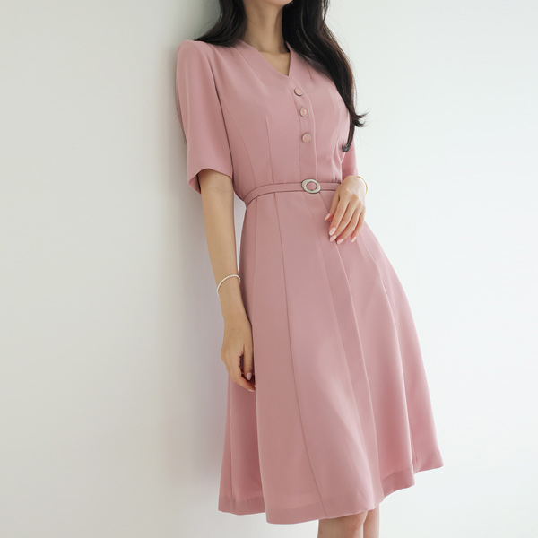 ブイネック 3つ ボタン ベルティード フレア ワンピース