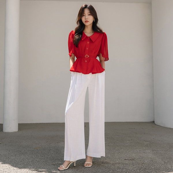 シフォン パピヨンスリープ ペプラム ブラウス (ベルトSET)
