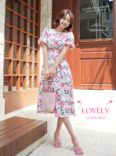 ラブリー 花柄 袖 パフ スモック バンディング ワンピース