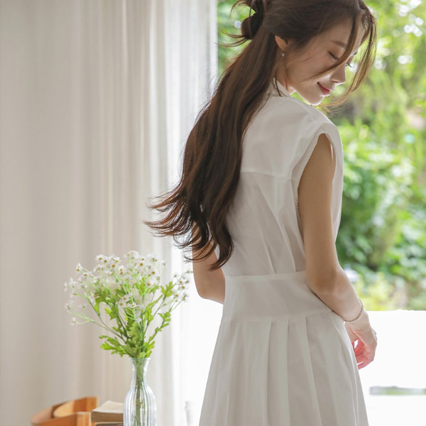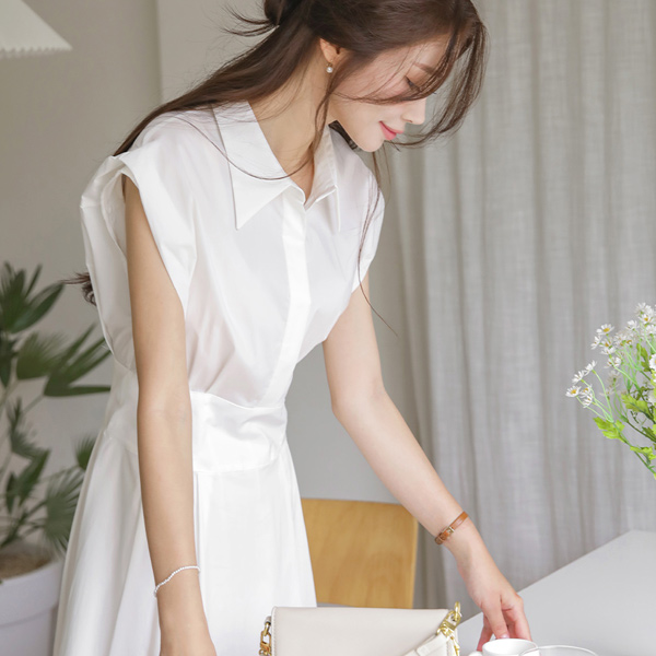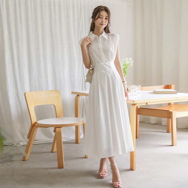 ピュア コットン シャツ カラー 二重 袖 フレア ロング ワンピース