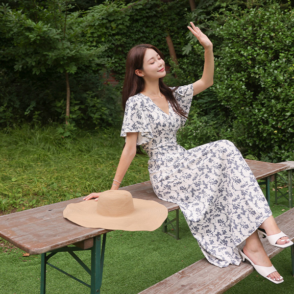 サマー 花柄 ラップ 翼 袖 サイド 切開 ロング ワンピース