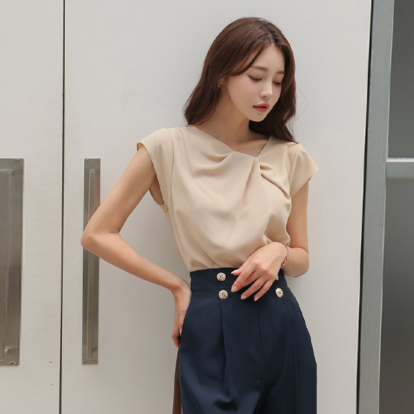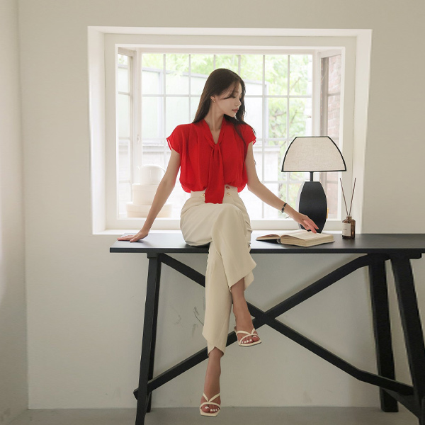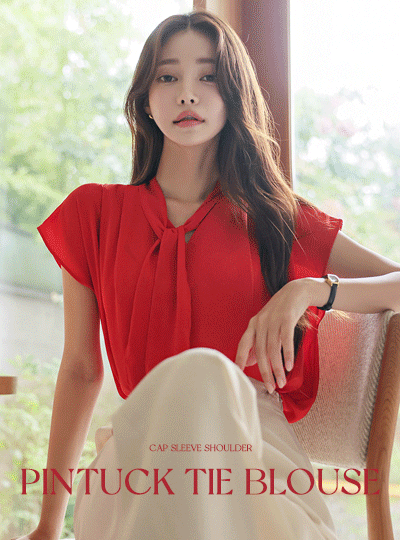 キャップップ ショルダー ピンタック タイ ブラウス